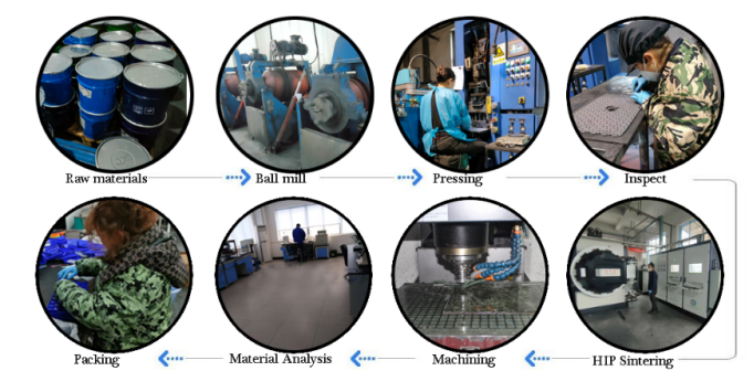 原料制备:先准备好硬质化合物和粘结金属的粉末。硬质化合物的粉末通常由钨、钴、钛、铬等金属的碳化物、氮化物或硼化物制成。粘结金属的粉末通常由镍、铁、钴等金属或其合金制成。